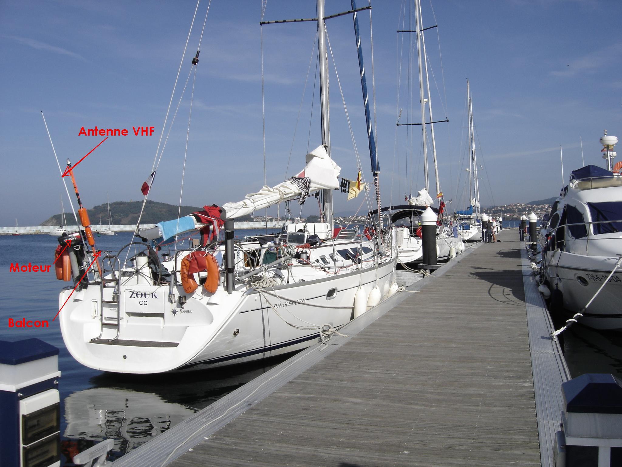 Cette antenne était montée à cheval sur le balcon arrière. L'antenne installée à côté du moteur hors bord de l'annexe. Ce genre de montage ne favorise pas le rayonnement haute fréquence. Le moteur et le balcon en métal absorbent la haute fréquence. C'est un peu comme si vous mettiez votre antenne dans une cage de Faraday (boite de métal). De plus, il y a un mât sur un voilier et il est préférable pour augmenter la portée VHF, d'y installer l'antenne à son sommet.