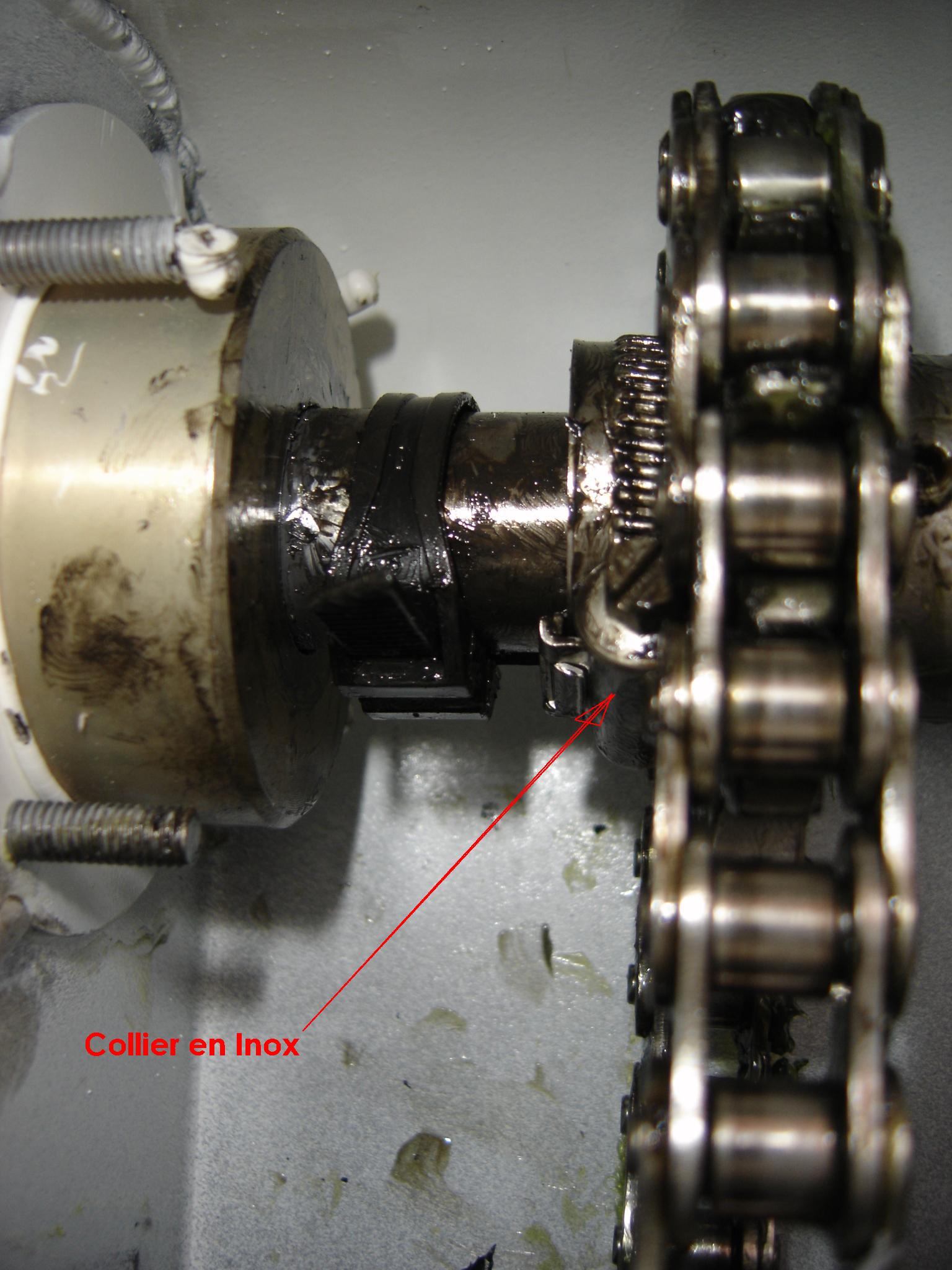 Suite des signes de fatigue de la barre à roue. En fait, cette fatigue est surtout dûe à un défaut de conception mais aussi nous avons constaté que ce problème était connu. En effet, les deux compas avaient déjà été démontés pour avoir accès aux roues à dents qui entraînent la chaîne de drosse. Cette roue crantée se décalait sur son axe malgré les deux vis de blocages. Il y avait un tel effort sur cette roue que ces deux petites vis se desserraient en permanence. Alors, la roue glissait vers le roulement arrière de l'axe, et les drosses touchaient le bâti en aluminium. Cela engendrait des points durs dans l'action de la barre et, le risque de casse. Nous avons trouvé la solution qui consistait à serrer un collier en inox pour tuyau d'arrosage sur l'axe de la barre à roue. Ce collier maintenait également la clavette. Nous avons remonté les compas tout en refaisant les joints au mastic polyuréthanne.