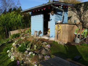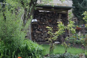 Les 600 litres de réserve d'eau récupérés par les 5m2 de la toiture des cabanes du jardin. Ajouter 2m2 du toit voisin du stock de bois
